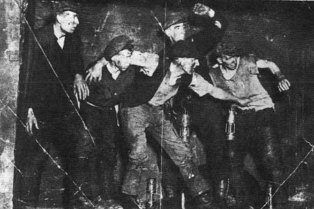 A dramatic moment in the play, 'Hewers of Coal' (1936). L to R: Alex Convery, Jimmy McPherson (behind), John Reid.