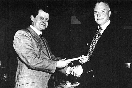The Marquis of Lothian (left) handing over the deeds to the Dean Tavern Chairman, Bobby Higginson in 1972.