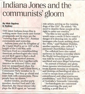 It never disappoints to see a bit of swashbuckling and glamour on celluloid and Indiana and Cate Blanchett this month make archaeology the vehicle for the fun and games .... although there are always a few killjoys around like Claire Smith who professes at Australia's Newcastle University [see below]