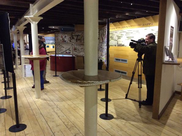 We had wondered where we might exhibit but in the end it was an easy decision since the assembly area at Oban Distillery was ready and willing. We fondly believe our tapestry will for a while to come carry the angel's share. We welcomed several hundred visitors, some en route to the distillery tour of course, but plenty of old friends from the 2010/ 2011 Highlands tour - including our own Tapestry 'stalker', Marjorie Haddo and friends. She was in Inverness for the Diaspora Tapestry just the week before arriving after closing time but gaining entry somehow! BBC Alba came too to capture the Gaelic occasion.