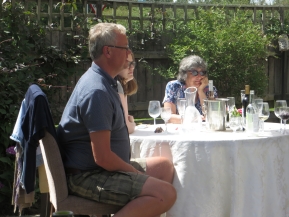 Juliette Healey dressed by request in black is pictured below with Pamela and Audrey … and Pam looks keen on a slice of that home made cake. I had a take-home portion which was a beautiful sponge! We'd wondered awhile whether we'd all be able to make it but the sun shone in Amanda and Nick great garden at The Grange, Edith Weston, and the family was able to socially distance as we must. Catering by Nick was palmary as ever- haddock and chips followed by apple pie and ice cream! Avril opted for home made hamburger and caramel cream. Mathew, Kathryn, Frankie and Maureen were on a stopover from Weymouth/ Ilkley. Nick's sister Michelle, husband Butch and children were there along with Pamela's granddaughters Lizzie + Ollie and Sarah + Jamie + Freddie. Grandson Alex + Stephanie was MC. Pamela was overjoyed and delighted; and she deserved to be!