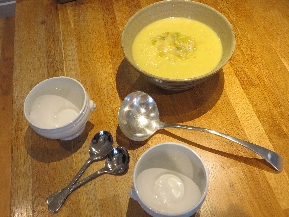 Home Made Soup then … The word went out that something remarkable is called for so here's the outcome. Mathew suggested Baked Bean Soup in honour of Grandpa Reg Turner for Ilkley … that was second to Heinz Tomato Soup. What he might have enjoyed is Porter's Roast Tomato and Lentil Soup from Silverstone as shown below right! [Congratulations Tony & Sylvia.] Too much snow affecting them up there in Ilkley it seems … Avril's preparation brought out the silver soup ladle and the Korean Tureen as well as the Lion's Soup Bowls to contain Home Made Leek and Potato; delicious. At the Manor House, alerted yestereve, Lady Dolphinstoun crafted Thai Red Curry Squash and Lentil Soup which the grandsons found not to their liking but the Baron clearly enjoyed greatly.